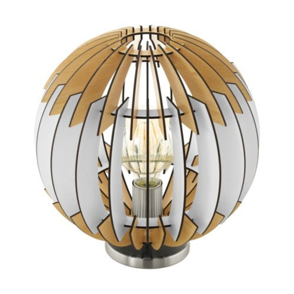 A MárkaEGLO OLMERO 1 asztali lámpa ideális választás beltéri világításhoz. Elegáns lamellás kialakításával és matt nikkel burkolatával modern környezetbe is könnyen illeszkedik. A lámpa 300 mm átmérőjű, 315 mm magasságú, és a burkolata acélból készült, míg a búra anyaga természetes fa, fehér színben.
