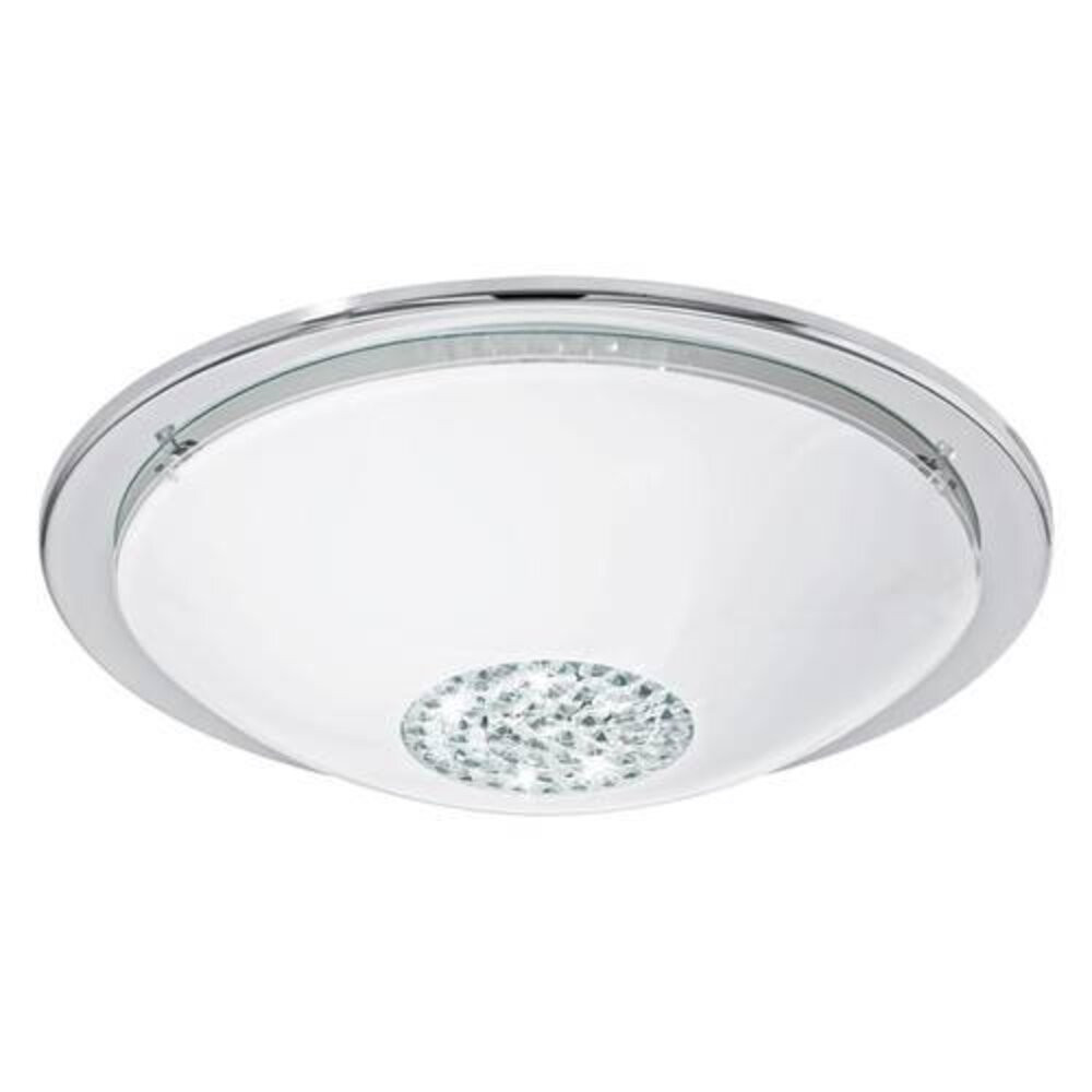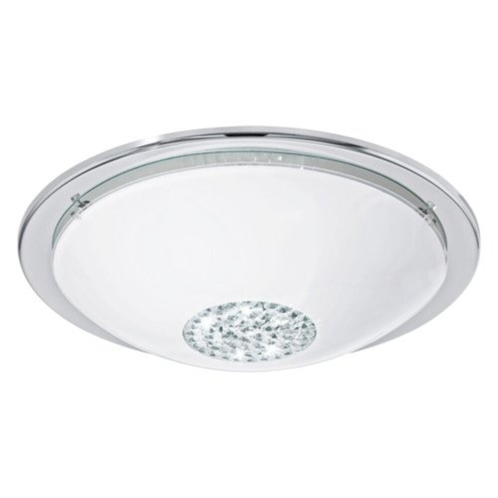 Ez a GIOLINA sorozatbeli mennyezeti lámpa krómozott acélból, fehér üvegből és tiszta kristályokból készült, és cserélhető LED-lámpával van ellátva, amely meleg fehér fényt biztosít.