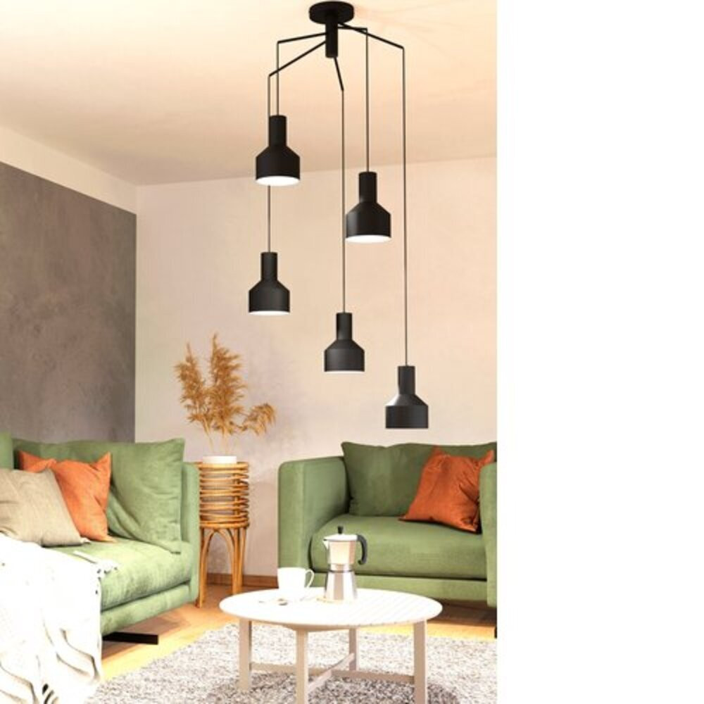 A CASBIARE függeszték lámpa öt fekete fém lámpából és egy fekete fém rögzítő elemből áll. Ez a különleges rögzítési forma és a monokróm dizájn mobilra emlékeztet, így figyelemfelkeltő váza lehet otthonában. A termék E27-es foglalatú, és 5 db E27-es fényforrást igényel, amelyek nem tartoznak a csomaghoz. Teremtsen egyedi hangulatot bármely belső térben ezzel az elegáns lámpával!