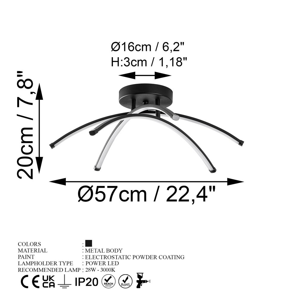 Elegáns fekete csillár, fém test, 57 x 20 x 57 cm | SMD LED 28W 3000K | Stílusos világítás a modern lakberendezéshez, IP20 besorolású, tökéletes nappaliba és étkezőbe