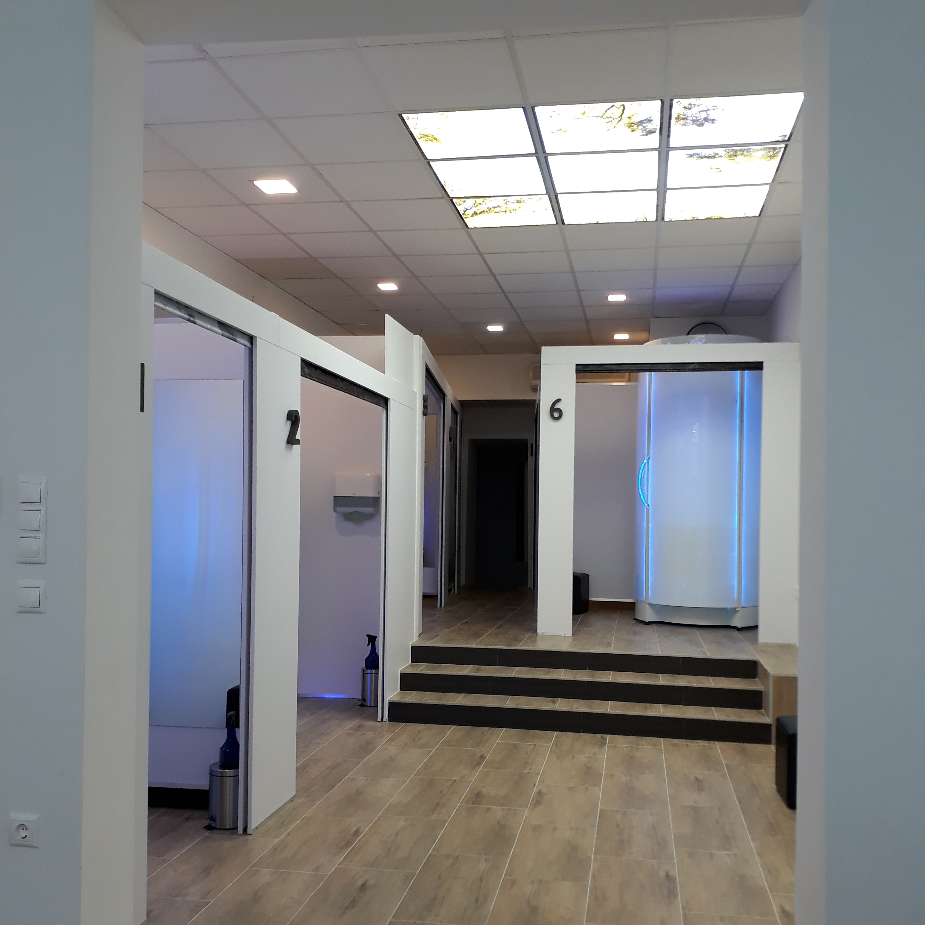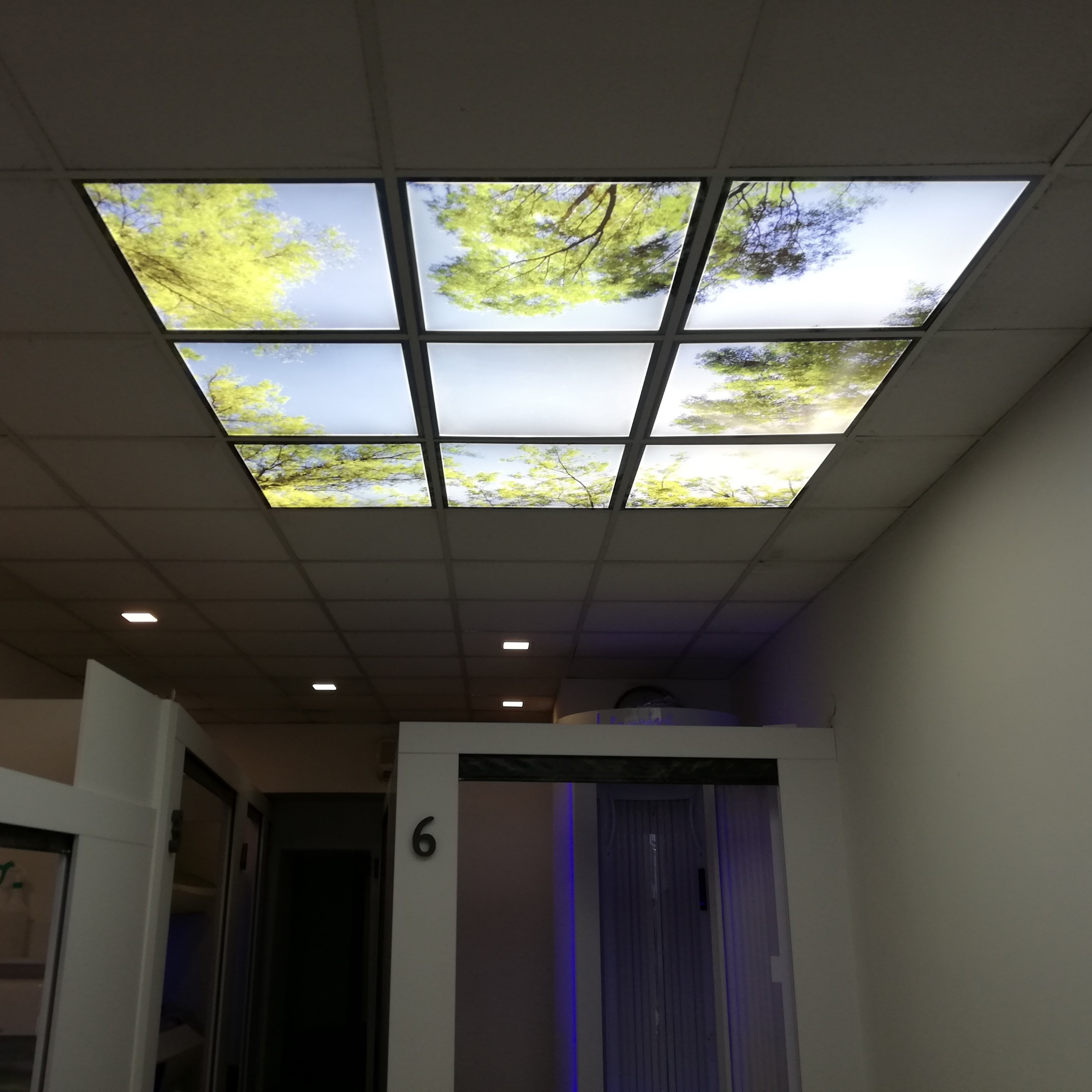 A szoláriumgépek feletti fővilágítást kilenc darab, 60x60 cm-es LED panel látja el, amelyeket süllyesztve építettünk be az álmennyezetbe. A különlegességük azonban nem csak a kiváló fényminőségben rejlik – ezek a panelek egyedi grafikával ellátott fóliát kaptak, így egyszerre funkcionálnak világításként és dekorációként.