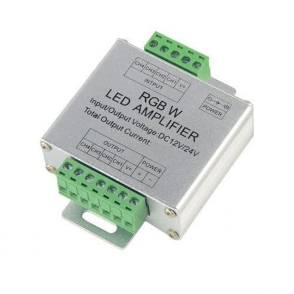 Jelerősítő egység RGBW LED vezérlőkhöz, illetve LED fényerő szabályzókhoz, amelyek RGB+W szalagokat vezérelnek