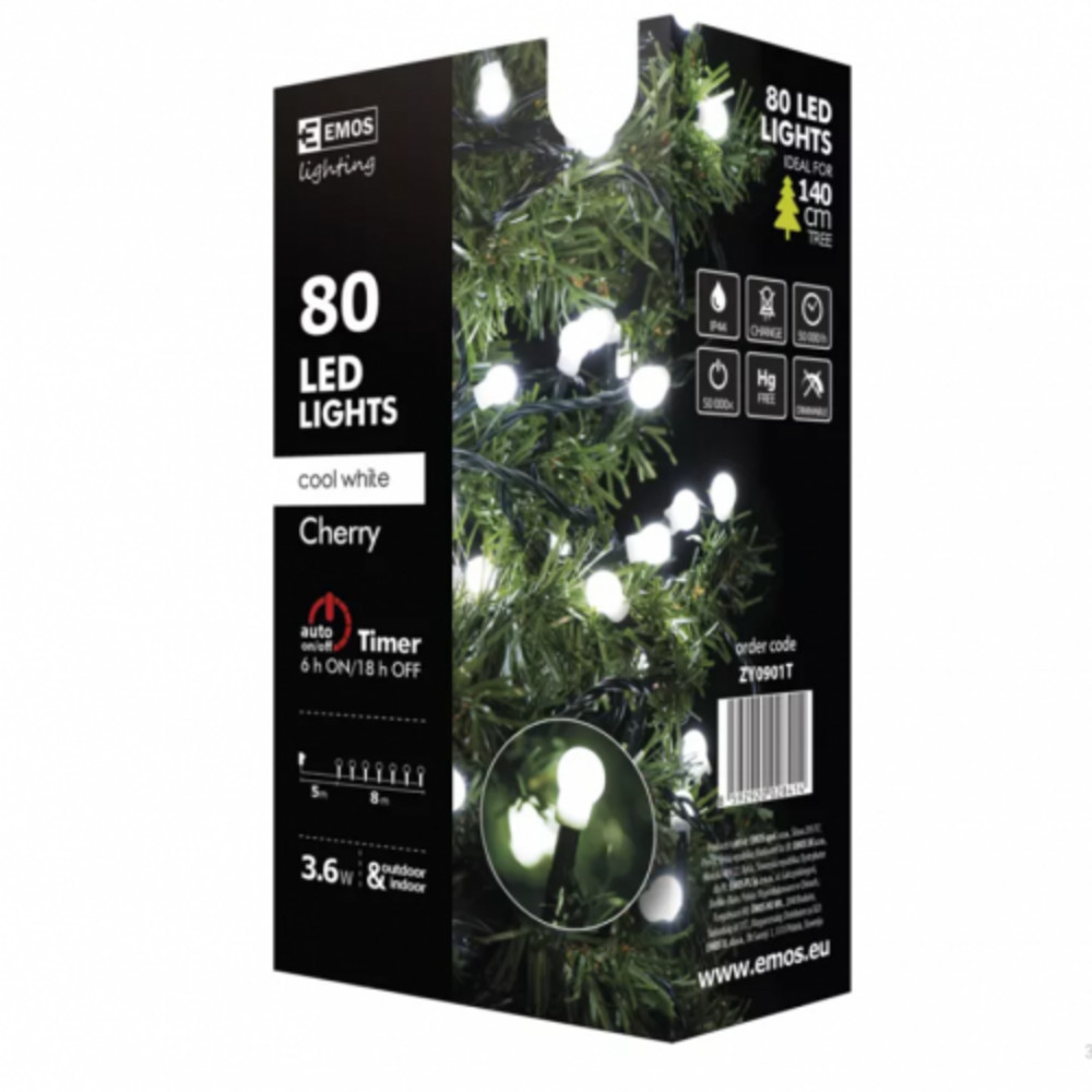 Led fényfüzér , beltéri/kültéri , cherry , 80 led , 8 m , hideg fehér , időzítős , IP44
