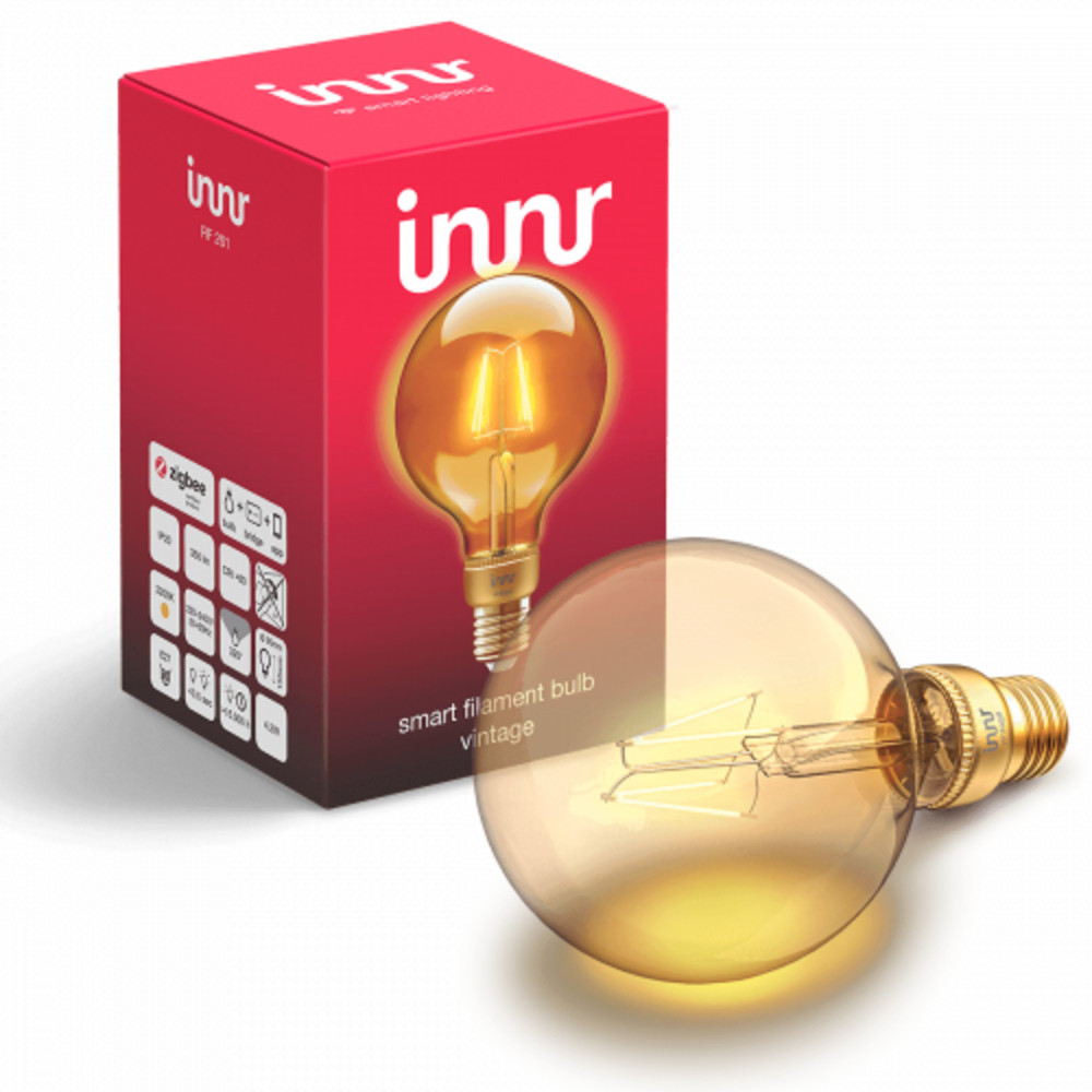 LED lámpa , égő , INNR , izzószálas hatás , filament , E27 , G105 , 4.2 Watt , borostyán sárga , meleg fehér , dimmelhető , Philips Hue kompatibilis