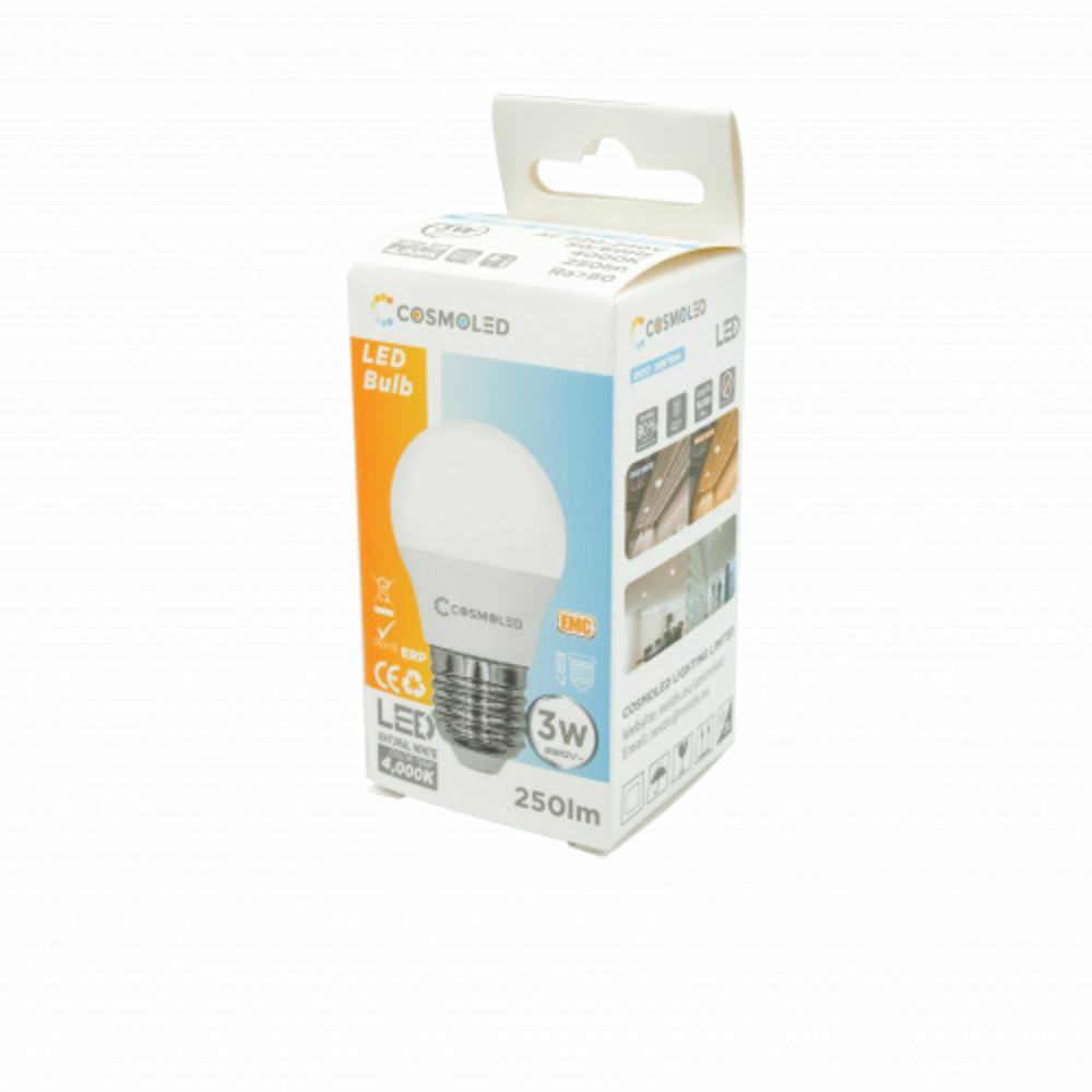LED lámpa , égő , kisgömb , E27 foglalat , 3W , természetes fehér , COSMOLED