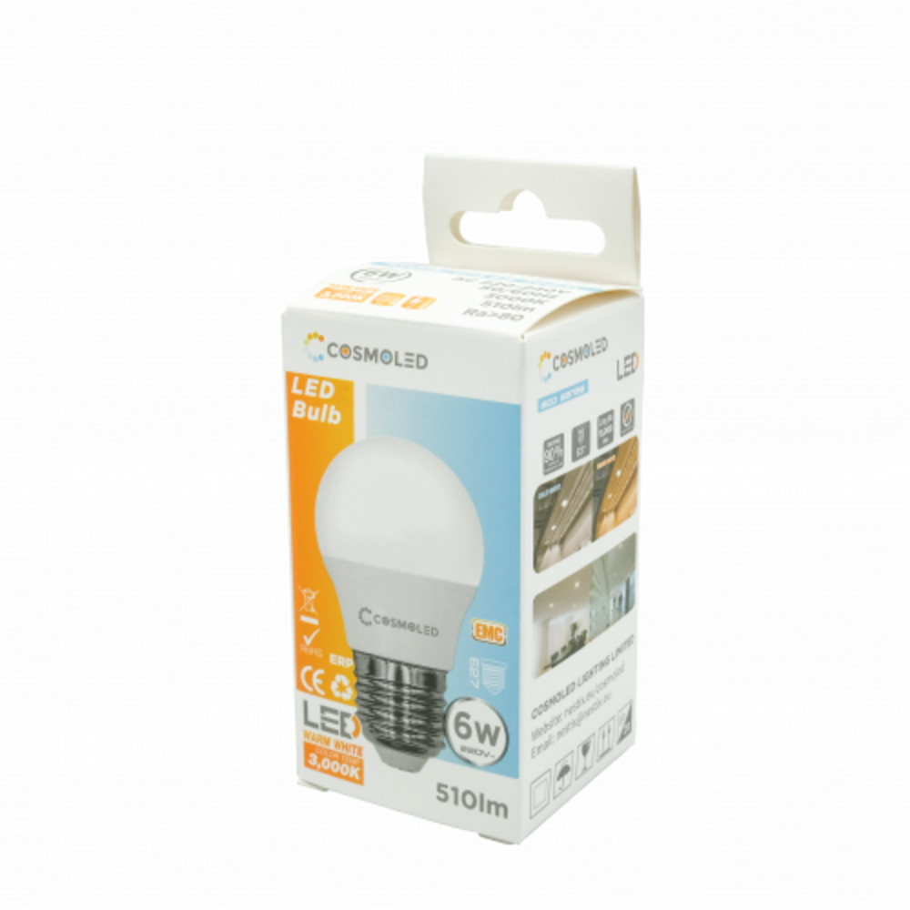 LED lámpa , égő , kisgömb , E27 foglalat , 6W , meleg fehér , COSMOLED