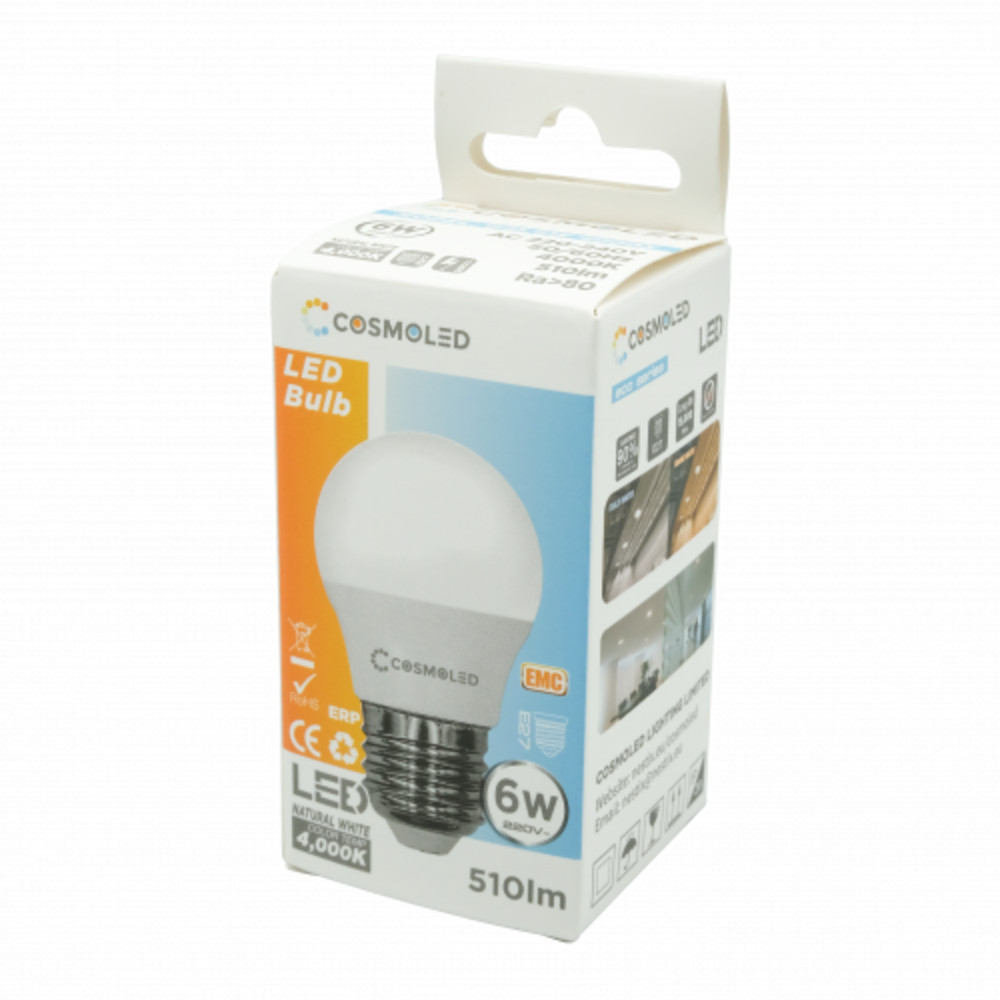 LED lámpa , égő , kisgömb , E27 foglalat , 6W , természetes fehér , COSMOLED
