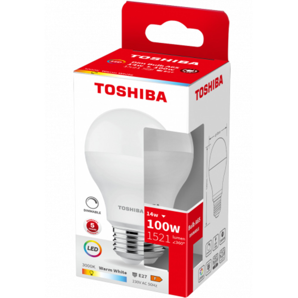LED lámpa , égő , körte , E27 foglalat , 14 Watt , 180° , meleg fehér , dimmelhető , TOSHIBA , 5 év garancia