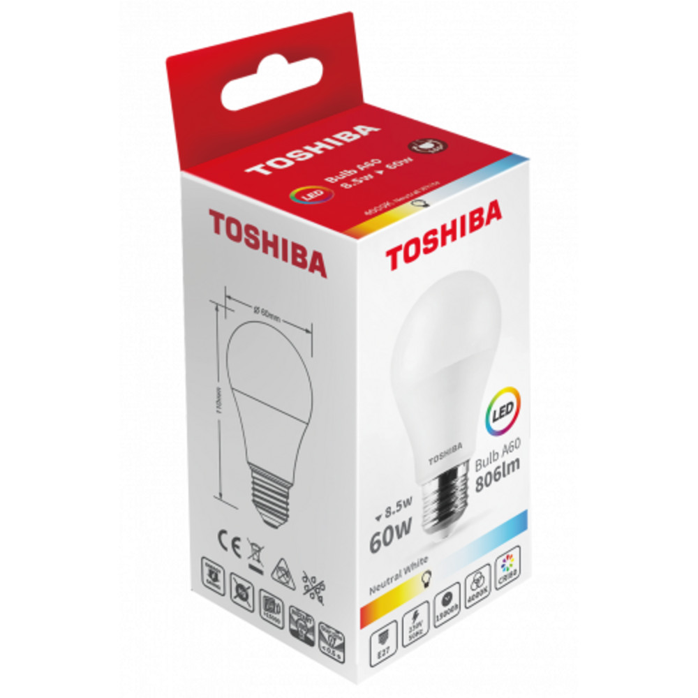 LED lámpa , égő , körte , E27 foglalat , 8.5 Watt , 180° , természetes fehér , TOSHIBA , 5 év garancia
