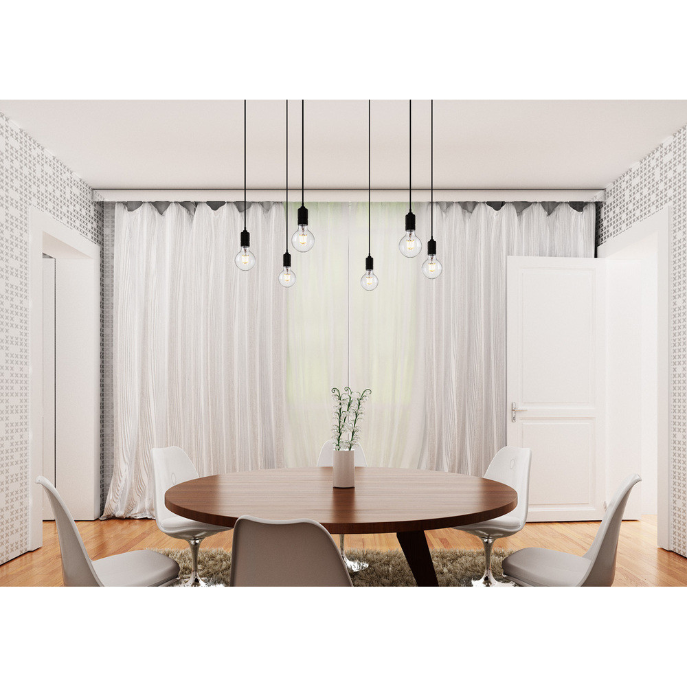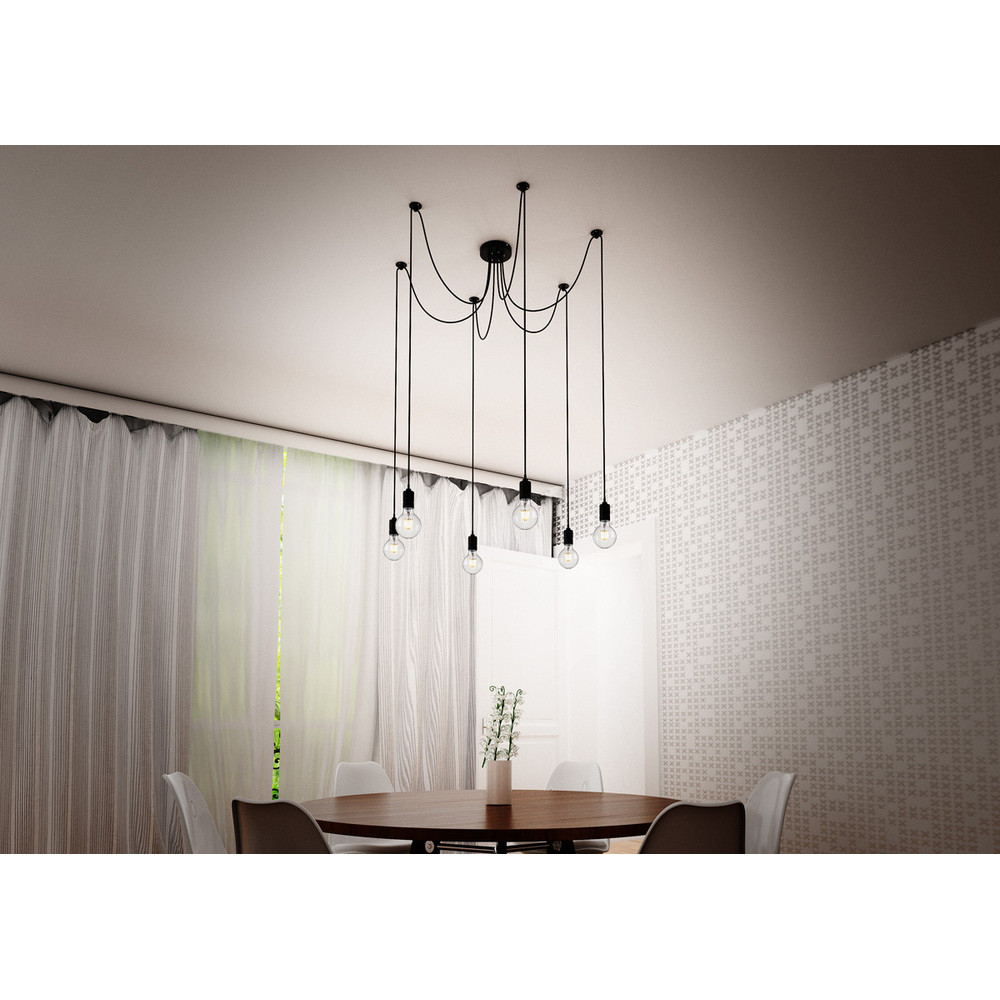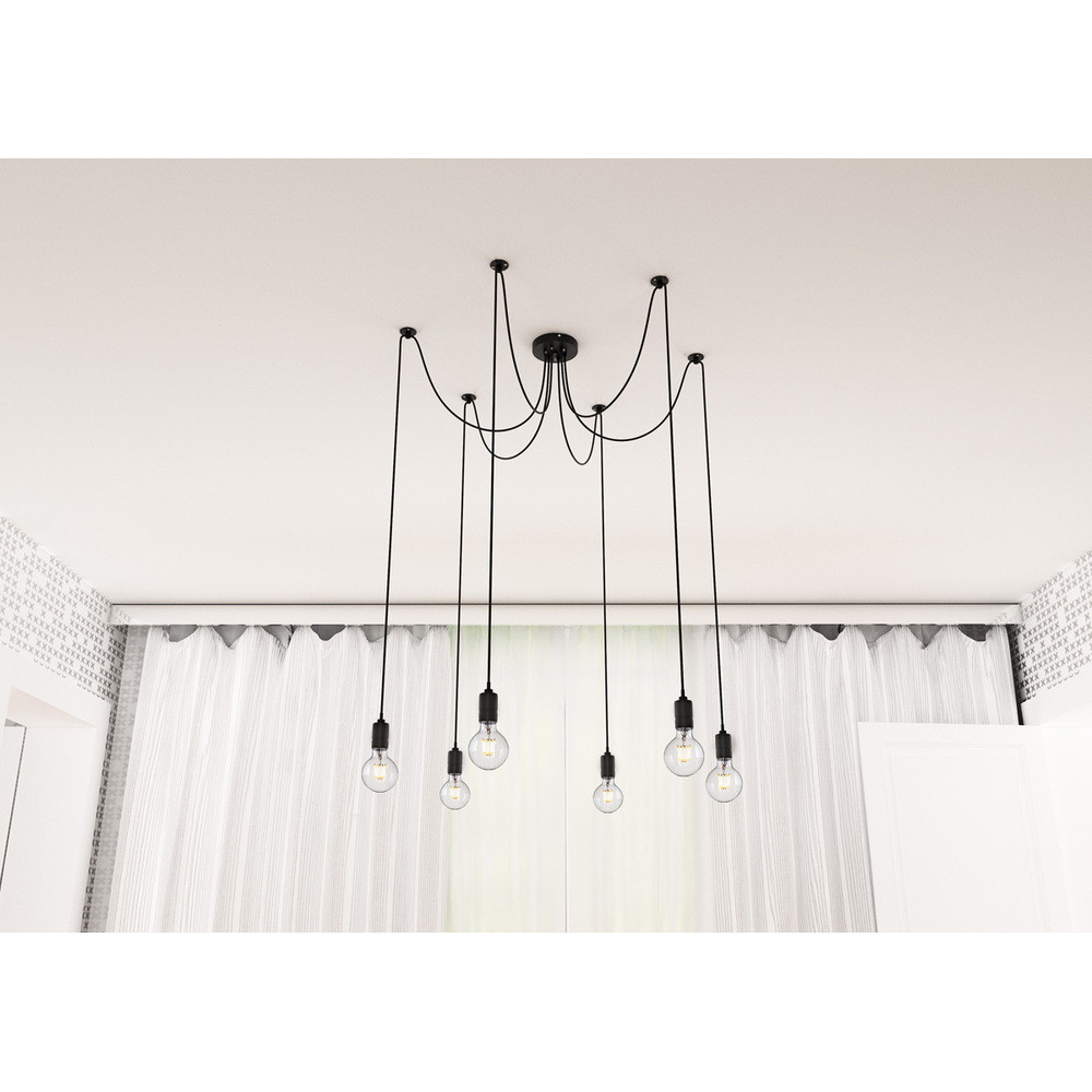 • Lámpa függeszték központi mennyezeti alappal és 6 egyedi csuklópánttal. A zsanérok mennyezeti tartókkal vannak felszerelve, amelyeket az alaptól külön-külön választott távolságra lehet elhelyezni. A kábel hossza 2 m.