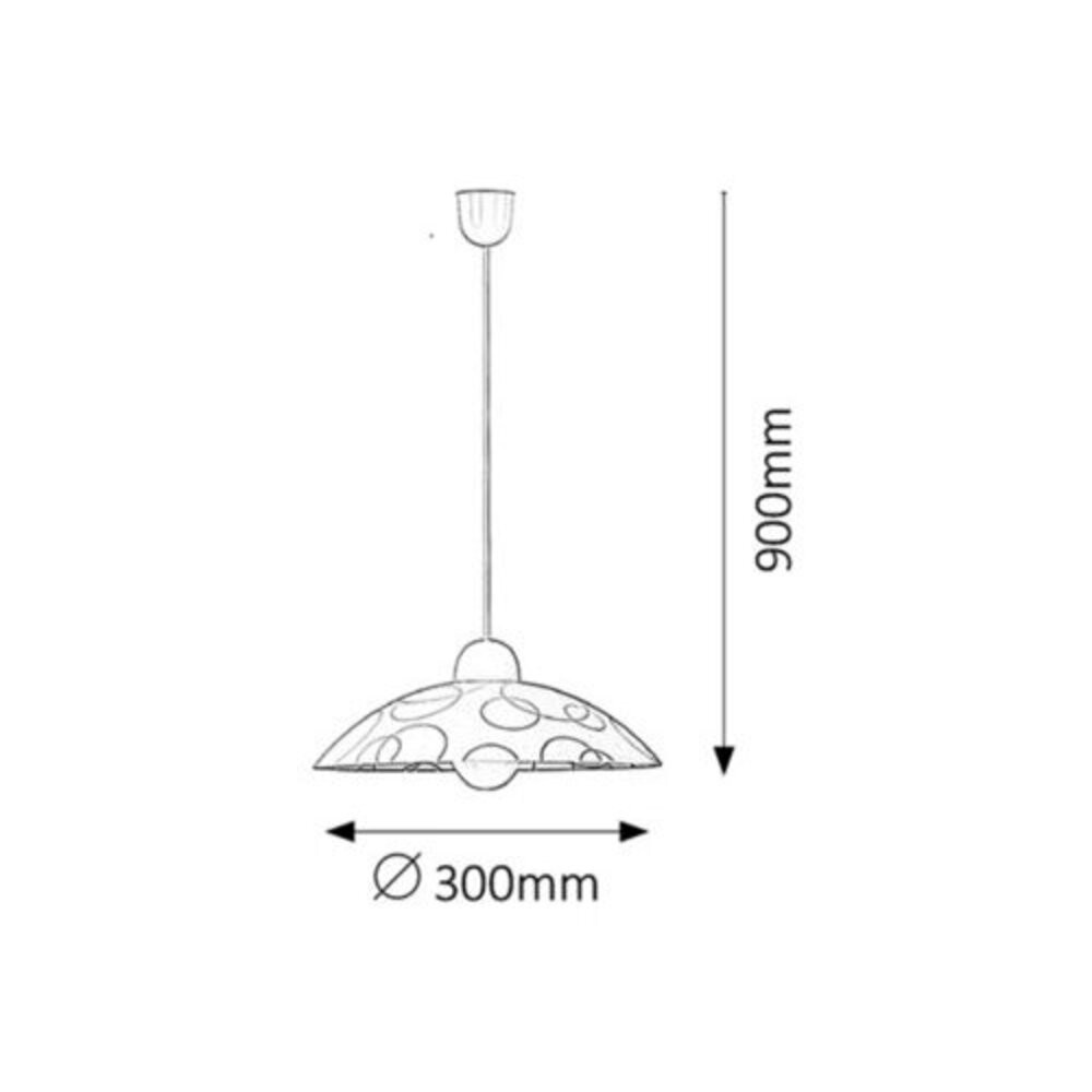 Időtlen megjelenésű függeszték, 30 cm átmérőjű, mintás üvegbúrával. Fix vezetékezés, 90 cm-es hosszúságú, fehér és áttetsző színű. Használható valamennyi E27-es, maximum 60W teljesítményű halogén vagy LED fényforrással.