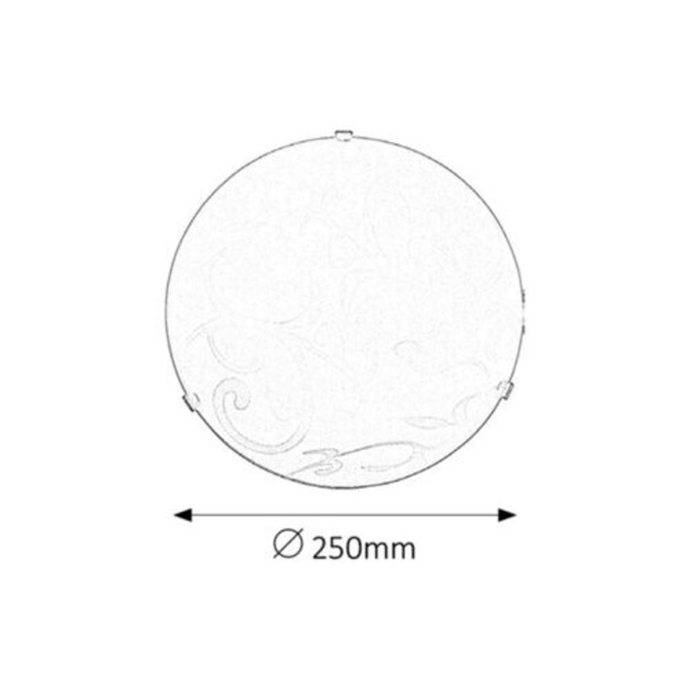 25 cm átmérőjű, időtlen megjelenésű mennyezeti lámpa. Fém és műanyag szerkezetű, mintás opálüveg lámpabúrával. E27-es foglalatú, maximum 60W teljesítményű, halogén vagy LED fényforrással is használható.