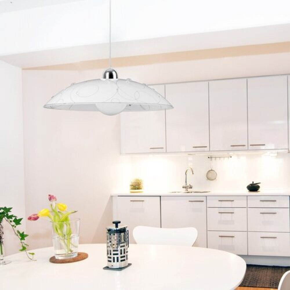 Időtlen megjelenésű függeszték, 40 cm átmérőjű, 3D hatású mintás, üveggyöngyözött üvegbúrával. Fix vezetékezés, 90 cm-es hosszúságú, fehér és króm színű. Használható valamennyi E27-es, maximum 60W teljesítményű, halogén vagy LED fényforrással. Kialakításának köszönhetően a fényforrás cseréje, illetve a lámpatest tisztítása gyorsan és egyszerűen elvégezhető.