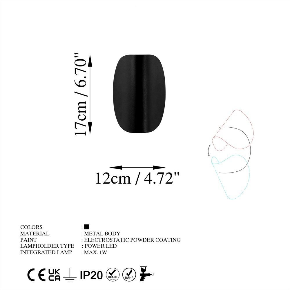 Stílusos fekete falilámpa, fém ház, 17 x 12 x 13 cm | IP20 besorolású, LED 1W 3000K | Tökéletes modern lakberendezéshez, elegáns világítási megoldás nappaliba, hálószobába és irodahelyiségekbe